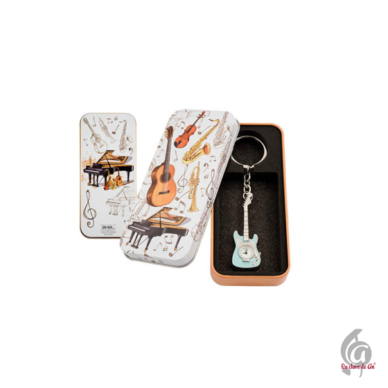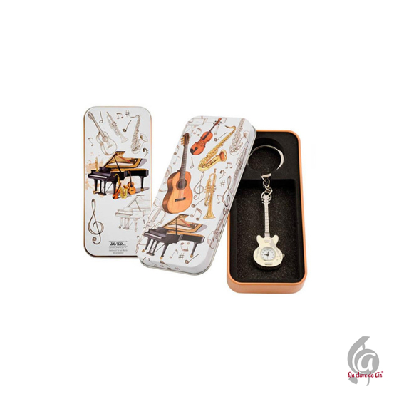Original llavero con forma de guitarra que incorpora un pequeño reloj funcional en la parte frontal, que permite consultar la...