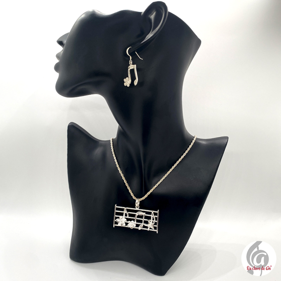 Colgante de plata con forma de corchea adornada con una delicada flor sobre un pentagrama, incluye un cordón de seda negro con...