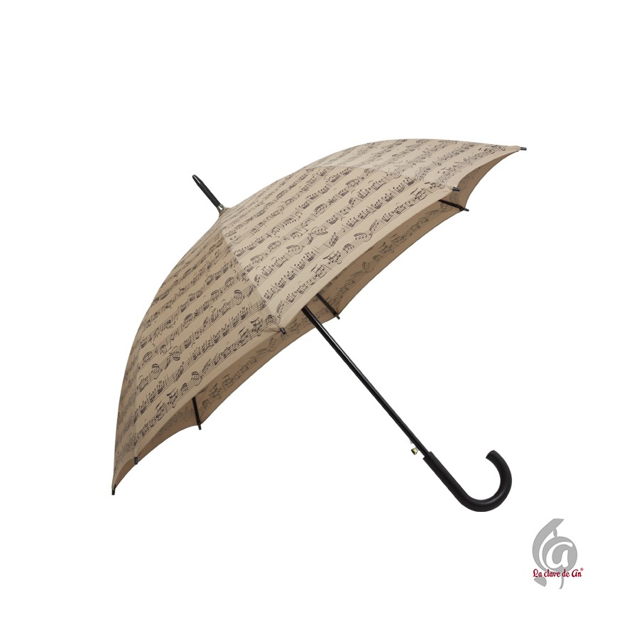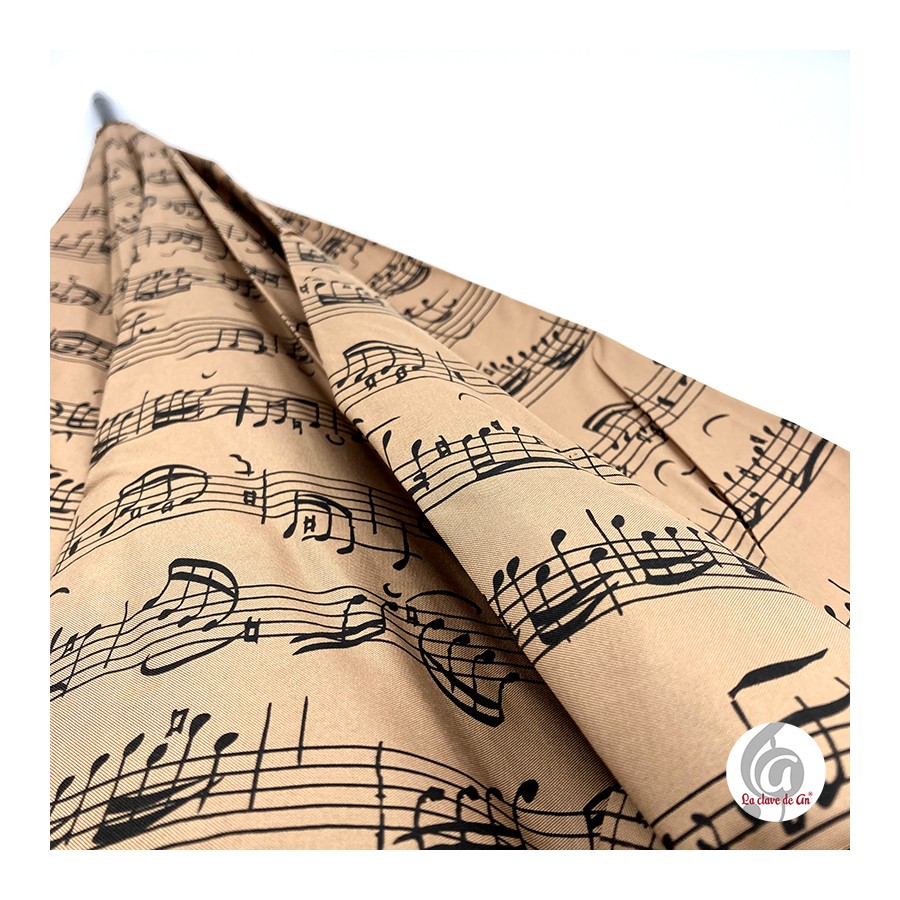 Paraguas marrón con motivos musicales en negro, más resistente gracias a su doble varilla.