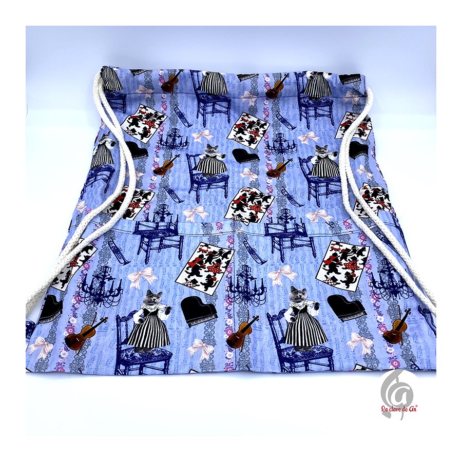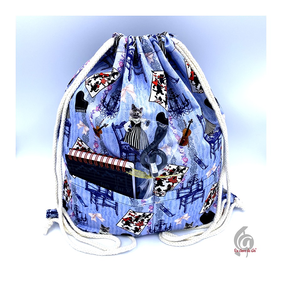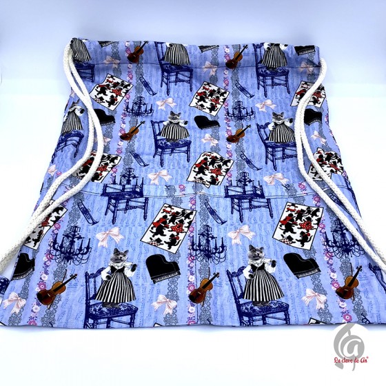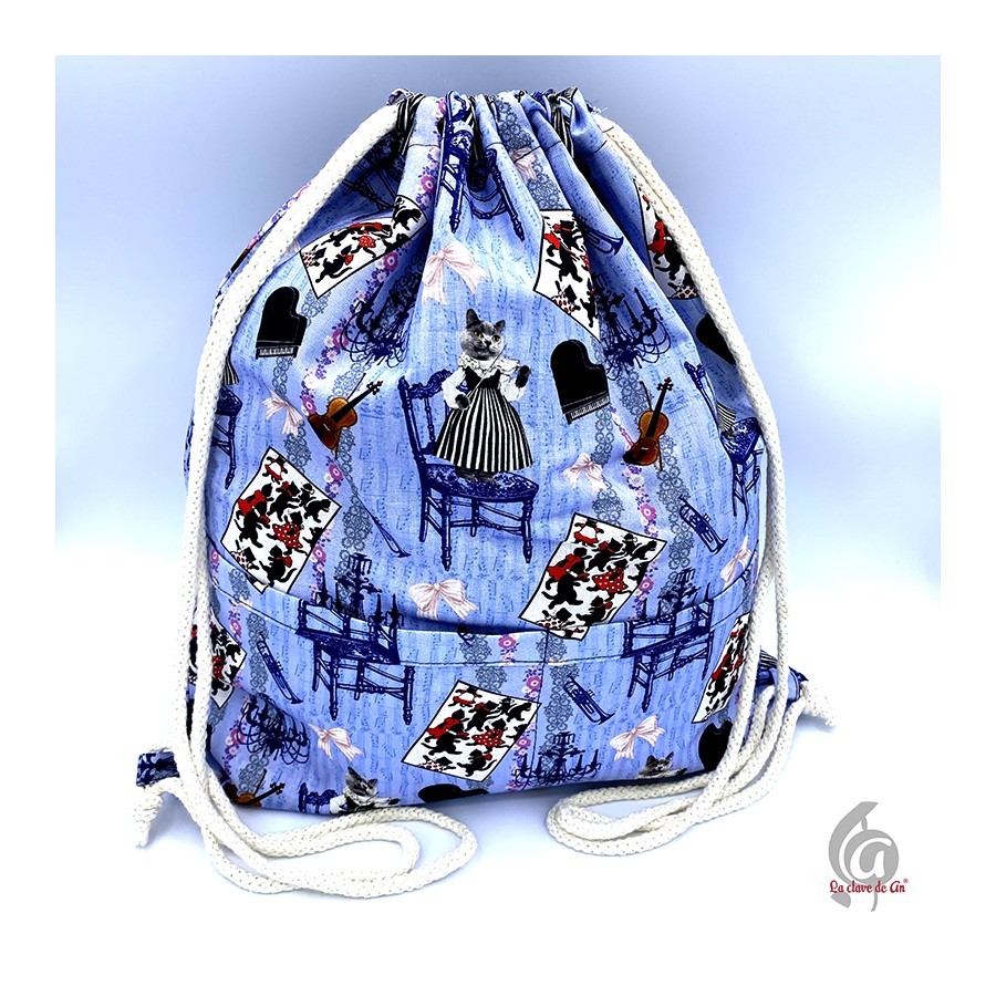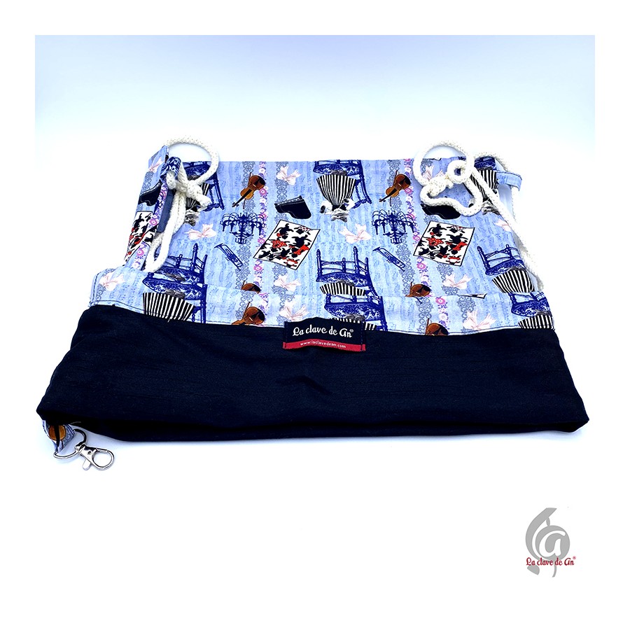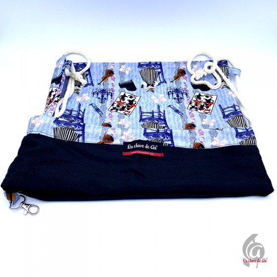 Mochila forrada de tela de algodón y poliéster, con 2 bolsillos exteriores, un mosquetón en el interior y fabricada artesanalmente en exclusiva para La clave de An.