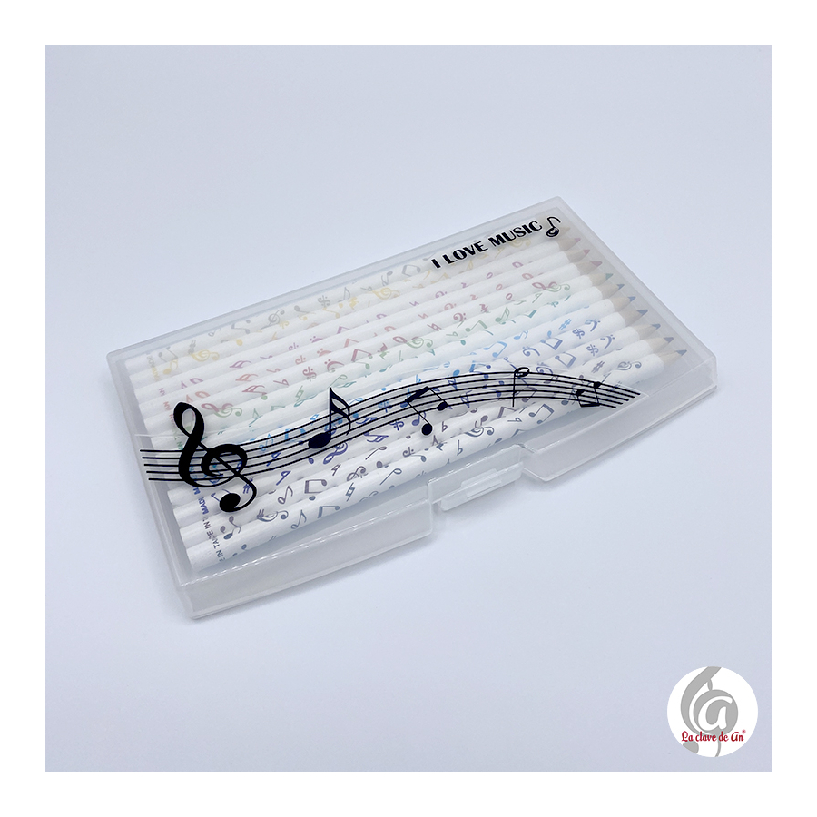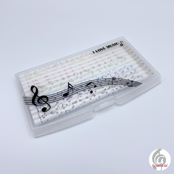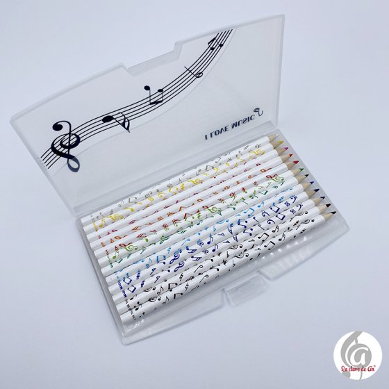 Estuche de plástico traslúcido que contiene 12 lápices de colores de madera circulares. Por fuera son de color blanco y el color de las notas musicales indican el color de la mina.