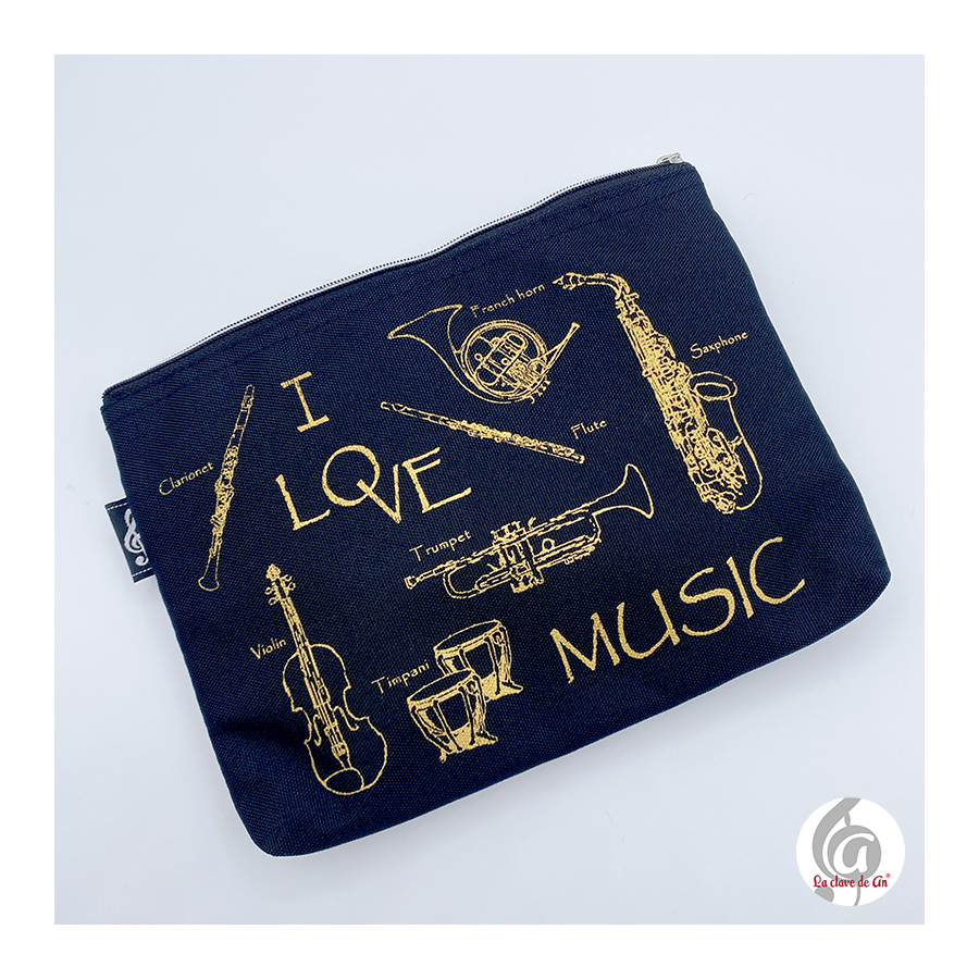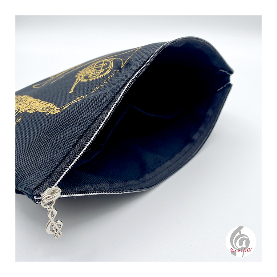 Estuche negro con una estampación de instrumentos musicales dorados. Tiene un compartimento principal con una separación interior, creando 2 espacios separados y un bolsillo exterior en la parte posterior.