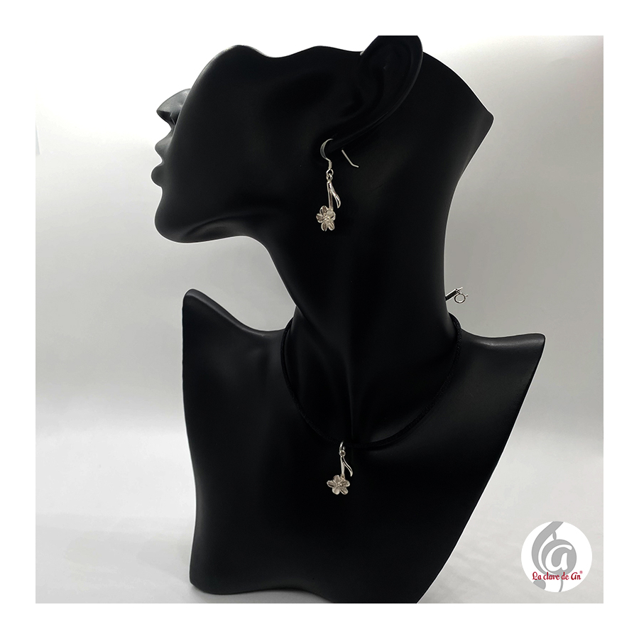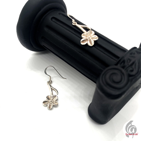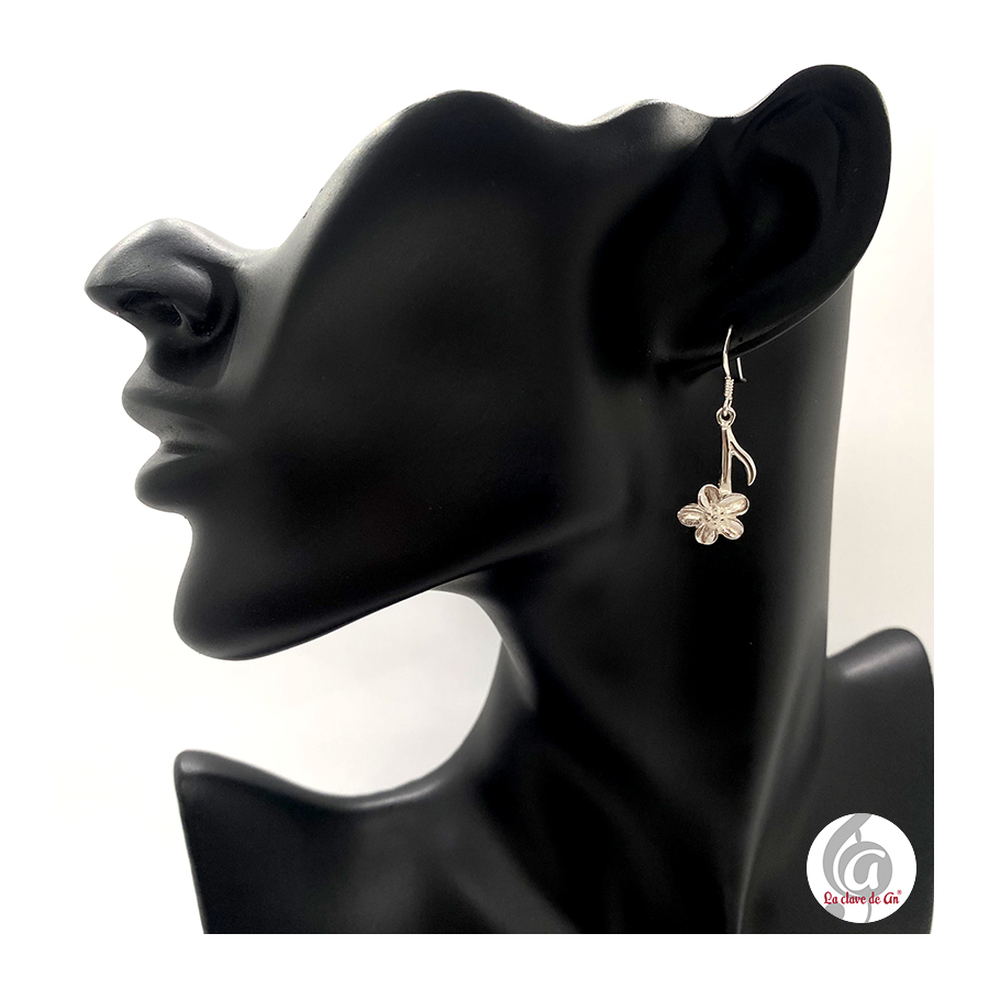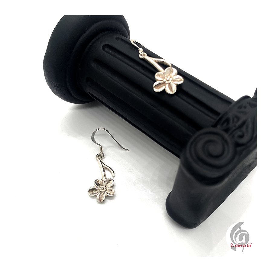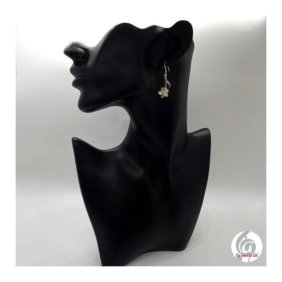 Pendientes de plata con forma de corchea adornada con una delicada flor. Joya hecha de forma artesanal en España. Diseño único y exclusivo de La Clave de An.