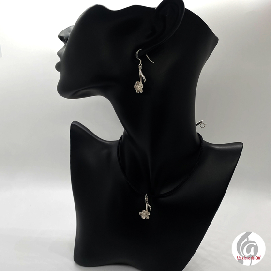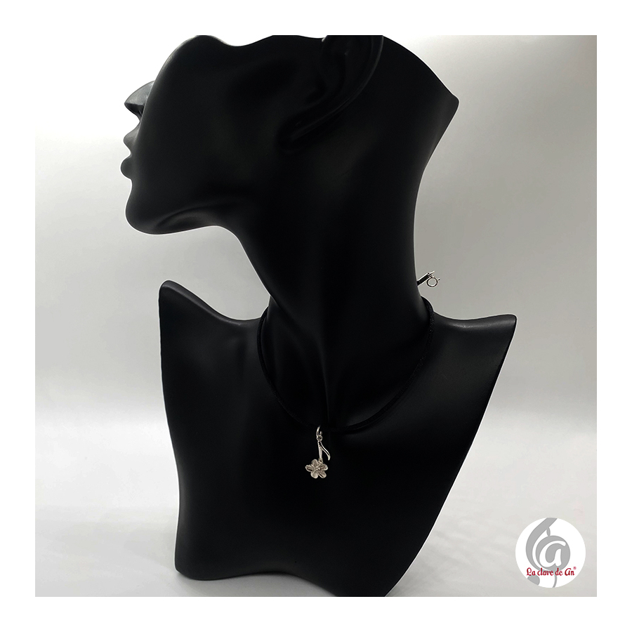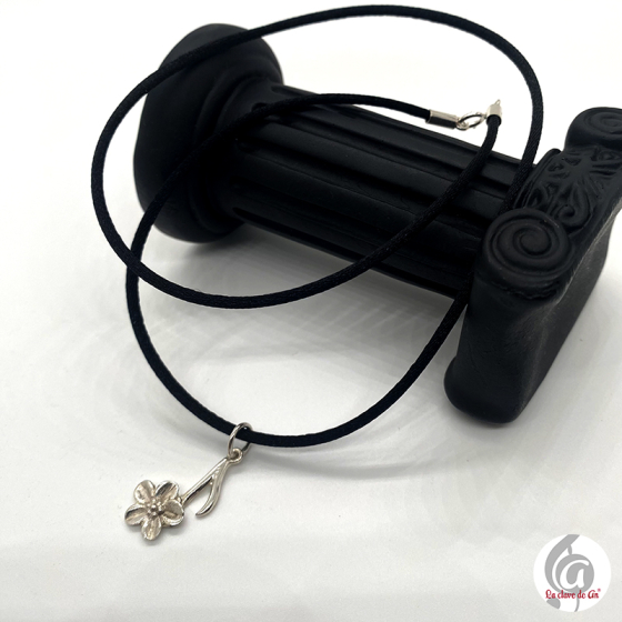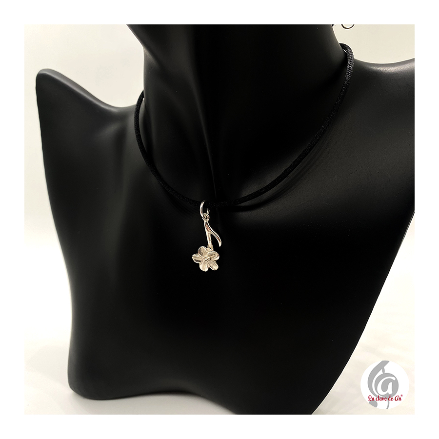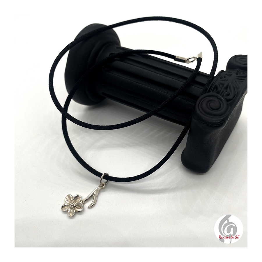 Colgante de plata con forma de corchea adornado con una delicada flor, incluye cordón de seda negro con cierre de plata. Joya hecha de forma artesanal en España. Diseño único y exclusivo de La Clave de An.