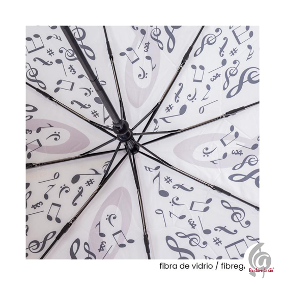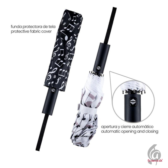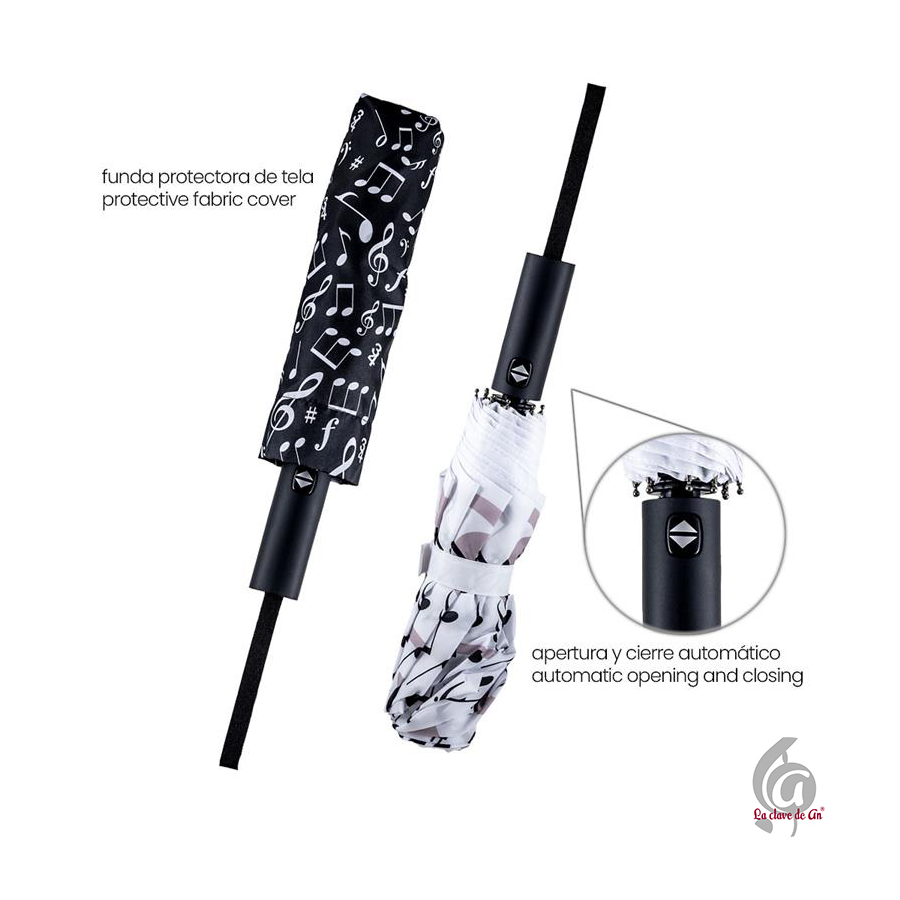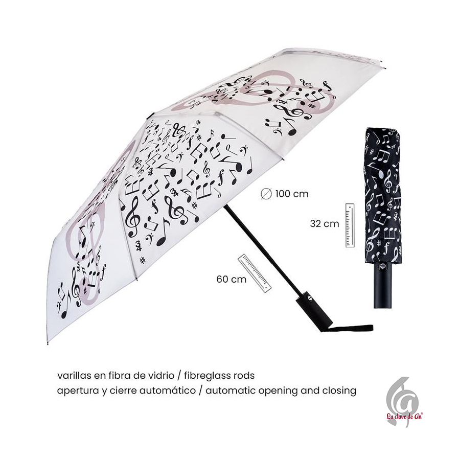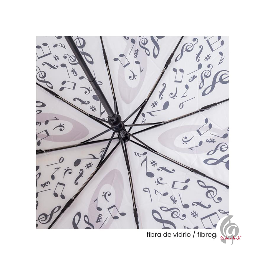 Paraguas plegable decorado con notas musicales y claves de sol. Su diseño artístico combina estilo y funcionalidad, ideal para amantes de la música que quieren destacar incluso en los días grises. Fabricado con varillas de fibra de vidrio para una mayor resistencia al viento, y sistema de apertura y cierre automático que facilita su uso. Su tamaño compacto permite guardarlo fácilmente en el bolso o mochila.