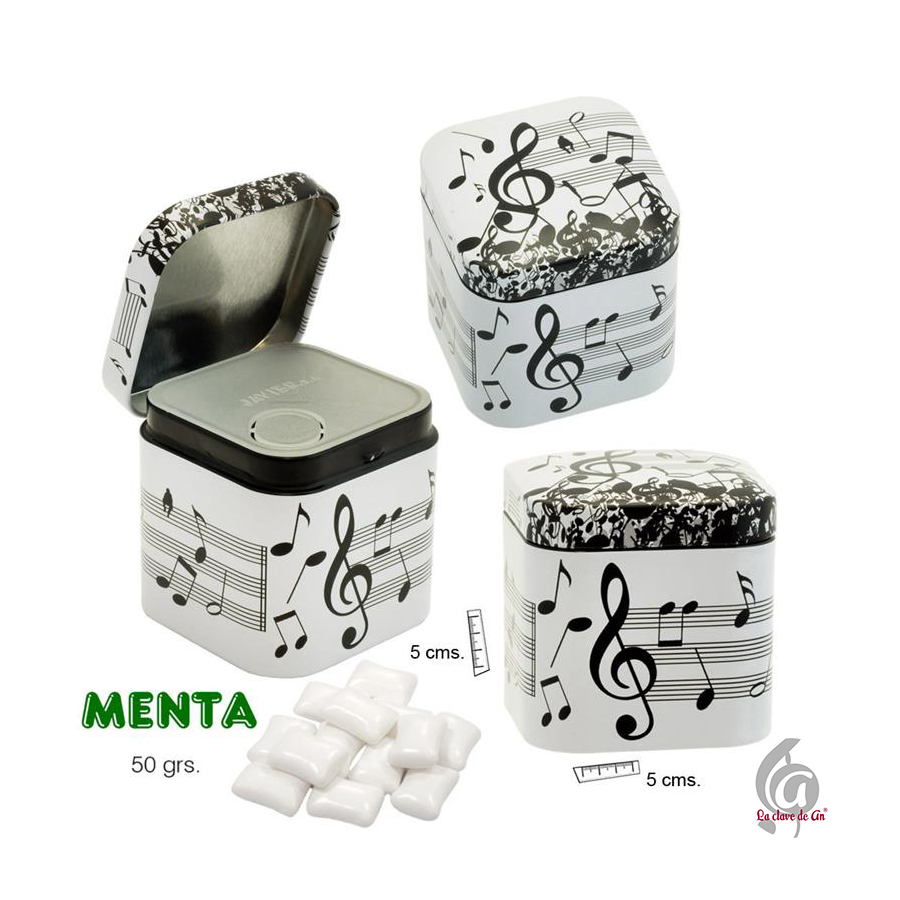 Lata metálica decorada con notas musicales que contiene 50 gramos de chicles sabor menta. Perfecta para llevar siempre en el bolso, estuche o bolsillo. Un regalo original para músicos, profesores, estudiantes y amantes de la música, que combina utilidad, frescura y un diseño único.