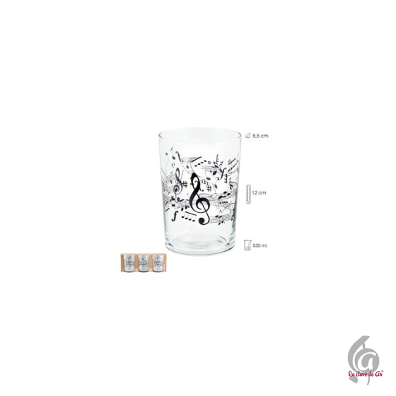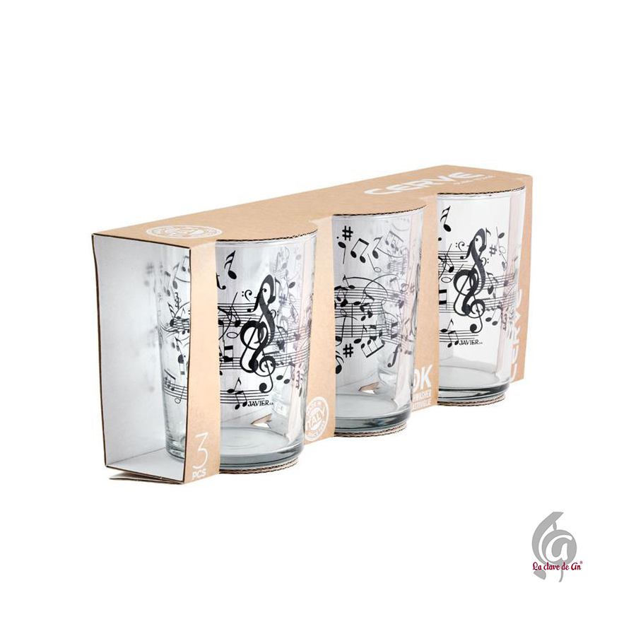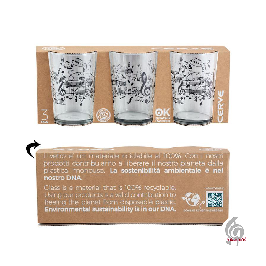 Disfruta de tus bebidas favoritas con estilo con este set de tres vasos de cristal hechos en Italia y diseñados en España con notas musicales. Su amplia capacidad de 530ml los convierte en la opción perfecta para agua, zumos, cócteles o refrescos, aportando un toque musical a tu mesa del día a día o a tus celebraciones.