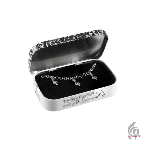 Colgante y cadena de 45cm con diseño bajo eléctrico, fabricado en metal inoxidable. Se presenta en un elegante estuche metálico decorado con ilustraciones musicales, ideal para regalar en cualquier ocasión especial o para llevar tu pasión por la música siempre contigo.