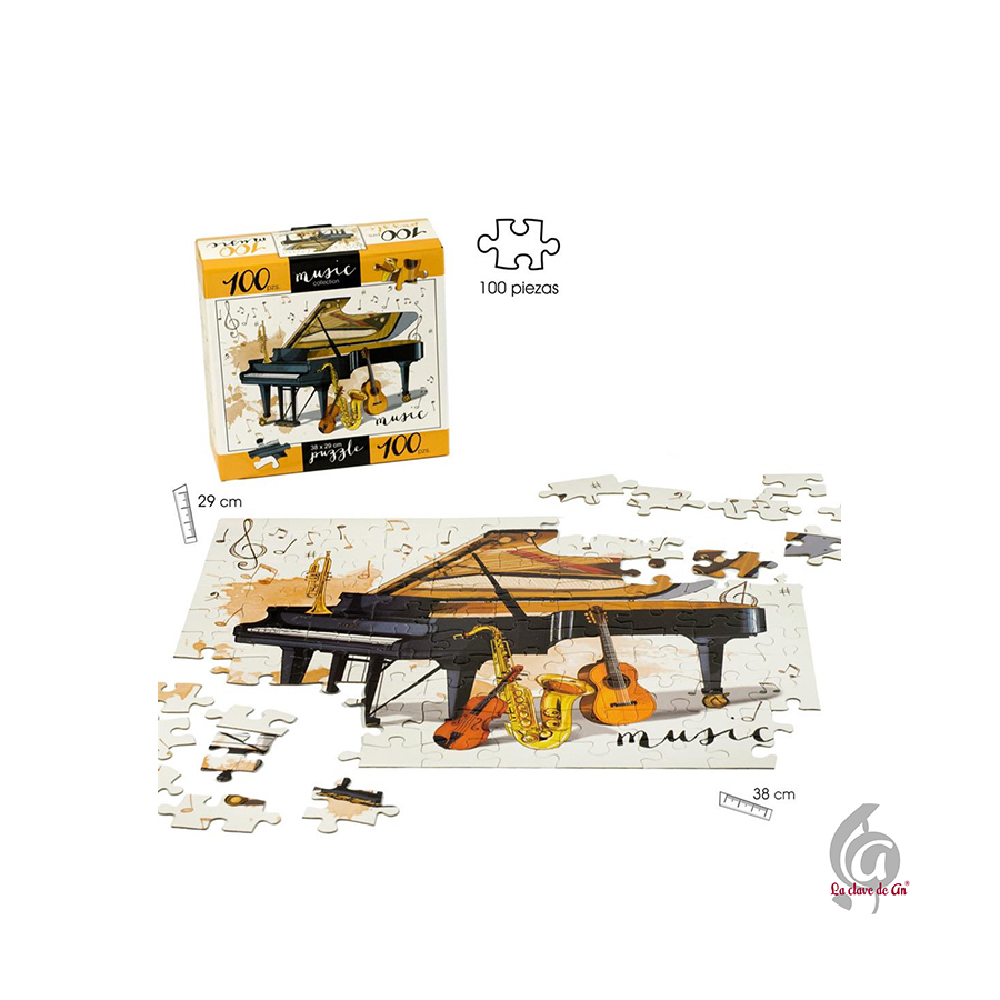 Divertido puzzle de 100 piezas con ilustración de instrumentos musicales, perfecto para niños, jóvenes y amantes de la música. Un entretenimiento ideal para desarrollar la concentración, la memoria visual y la coordinación, mientras se descubren diferentes instrumentos y detalles musicales en una imagen llena de color y dinamismo.