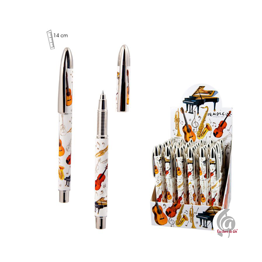 Original bolígrafo con tinta azul decorado con ilustraciones de instrumentos musicales. Su diseño atractivo y temático lo convierte en un accesorio ideal para el colegio, conservatorio, la oficina o como detalle especial, original y muy práctico.