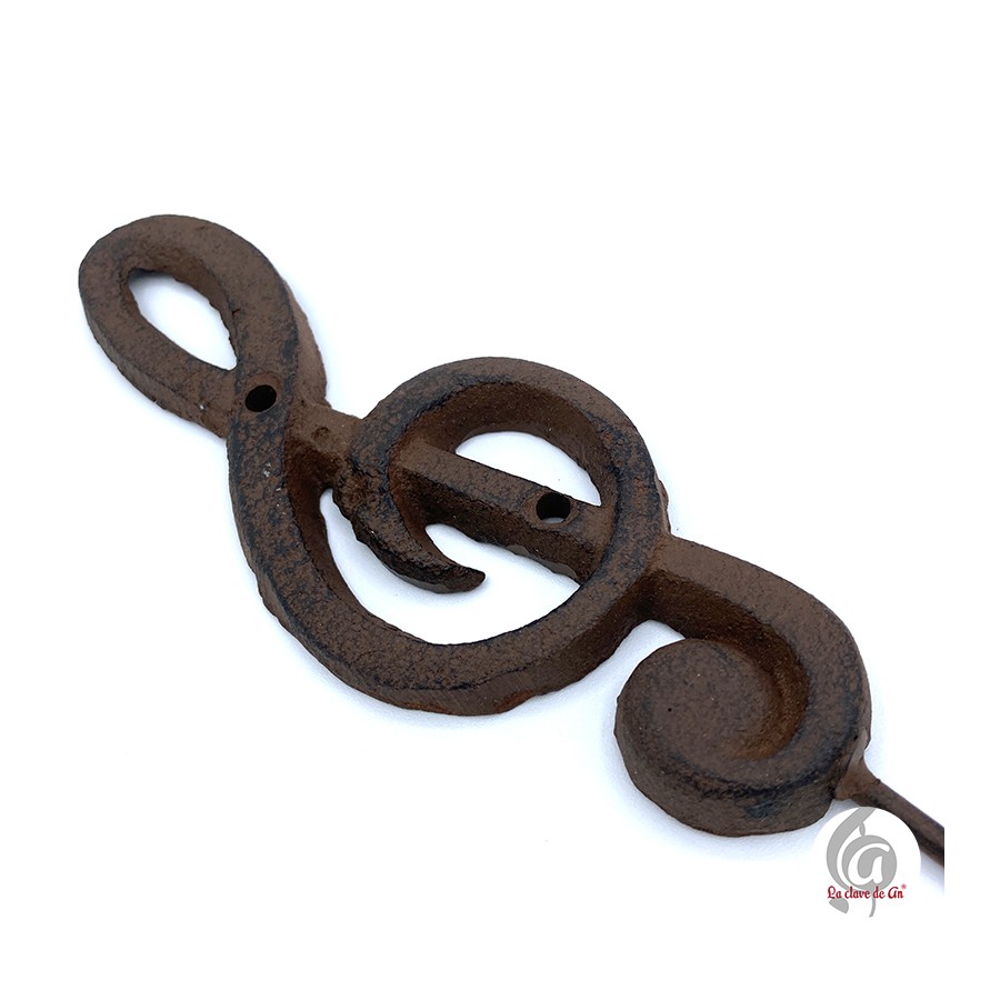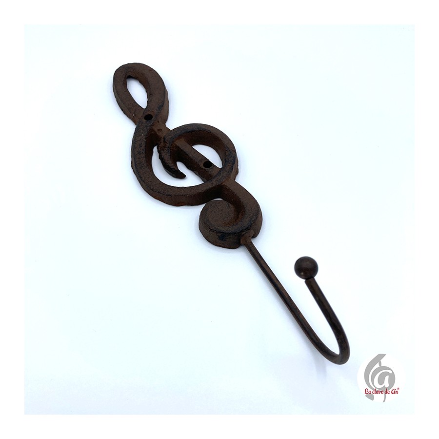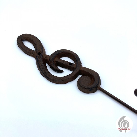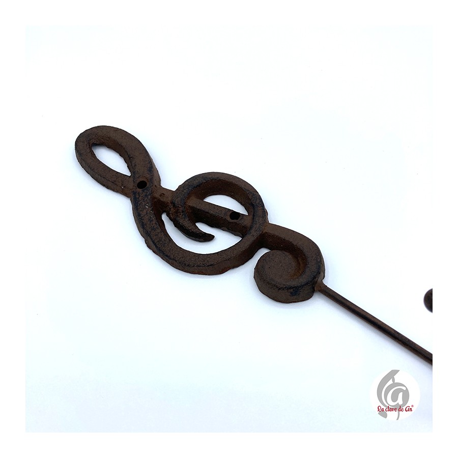 Perchero de hierro en color marrón con forma de clave de sol.