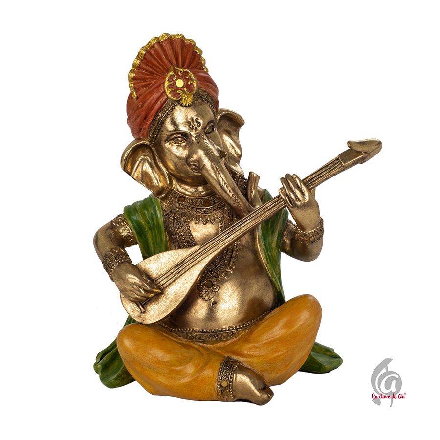Figura decorativa de Ganesha, el Dios hindú de la sabiduría, prosperidad y los nuevos comienzos, representado en posición meditativa mientras toca un instrumento musical, transmitiendo paz, armonía y conexión con la música. Elaborada en resina de alta calidad, con acabados en tonos dorados, verdes y naranjas que resaltan sus detalles artesanales. Perfecto como regalo musical simbólico y decorativo.