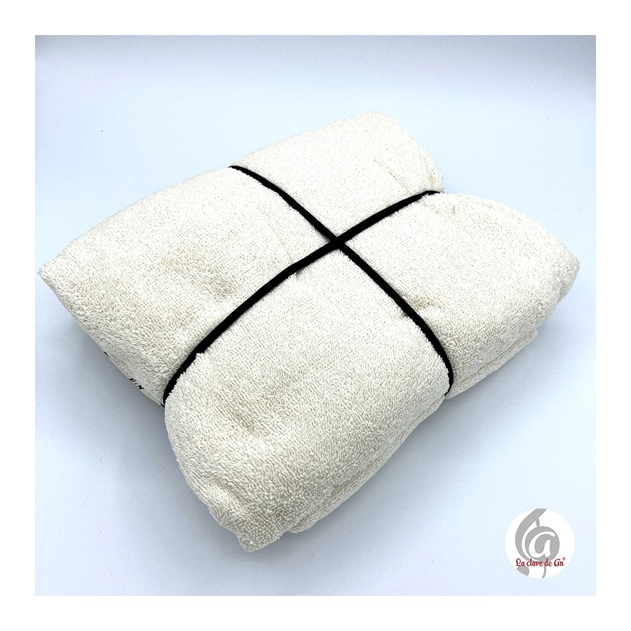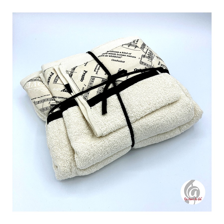 Juego de tres toallas de algodón con tela de motivos musicales en lino. Fabricado en Portugal.